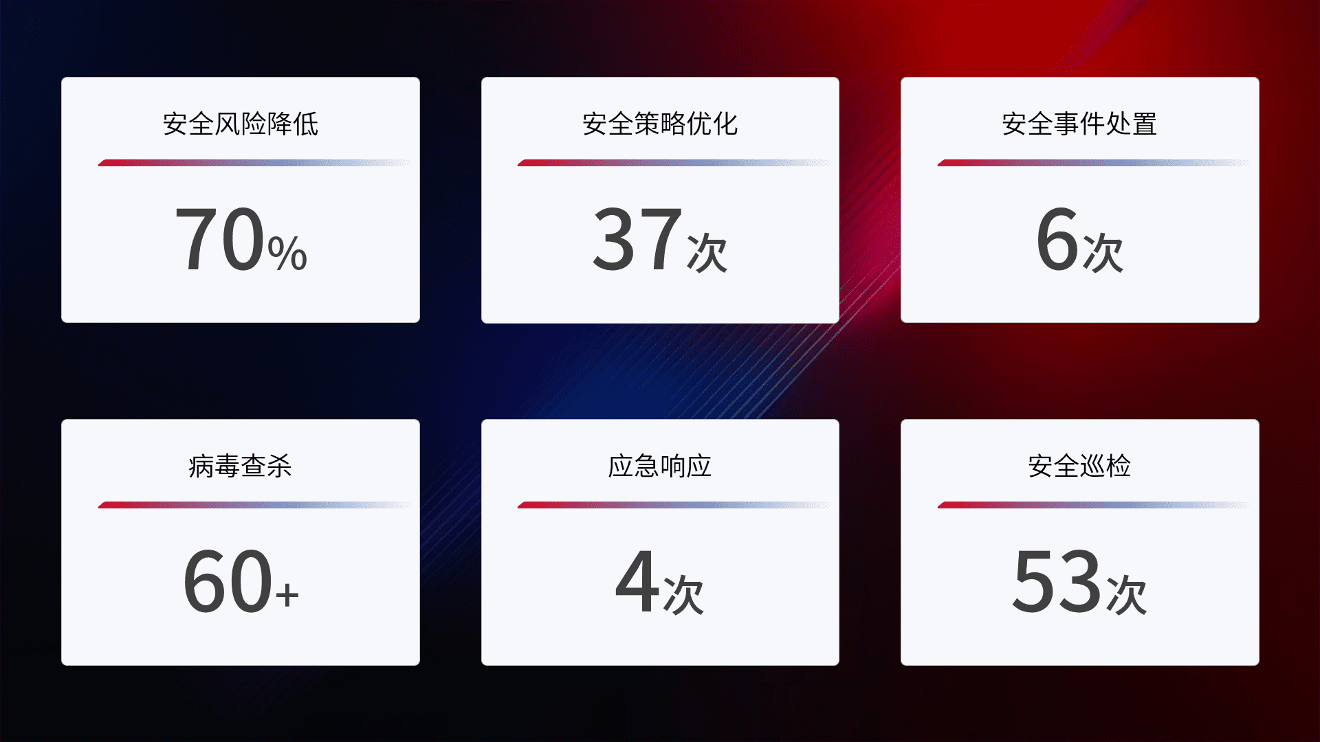 提供全面的安全事件报告体系,,,,包括处置报告、、、、周报、、、季度和年度总结,,结合持续监控,,,,帮助客户深入了解网络安全状况。。。。